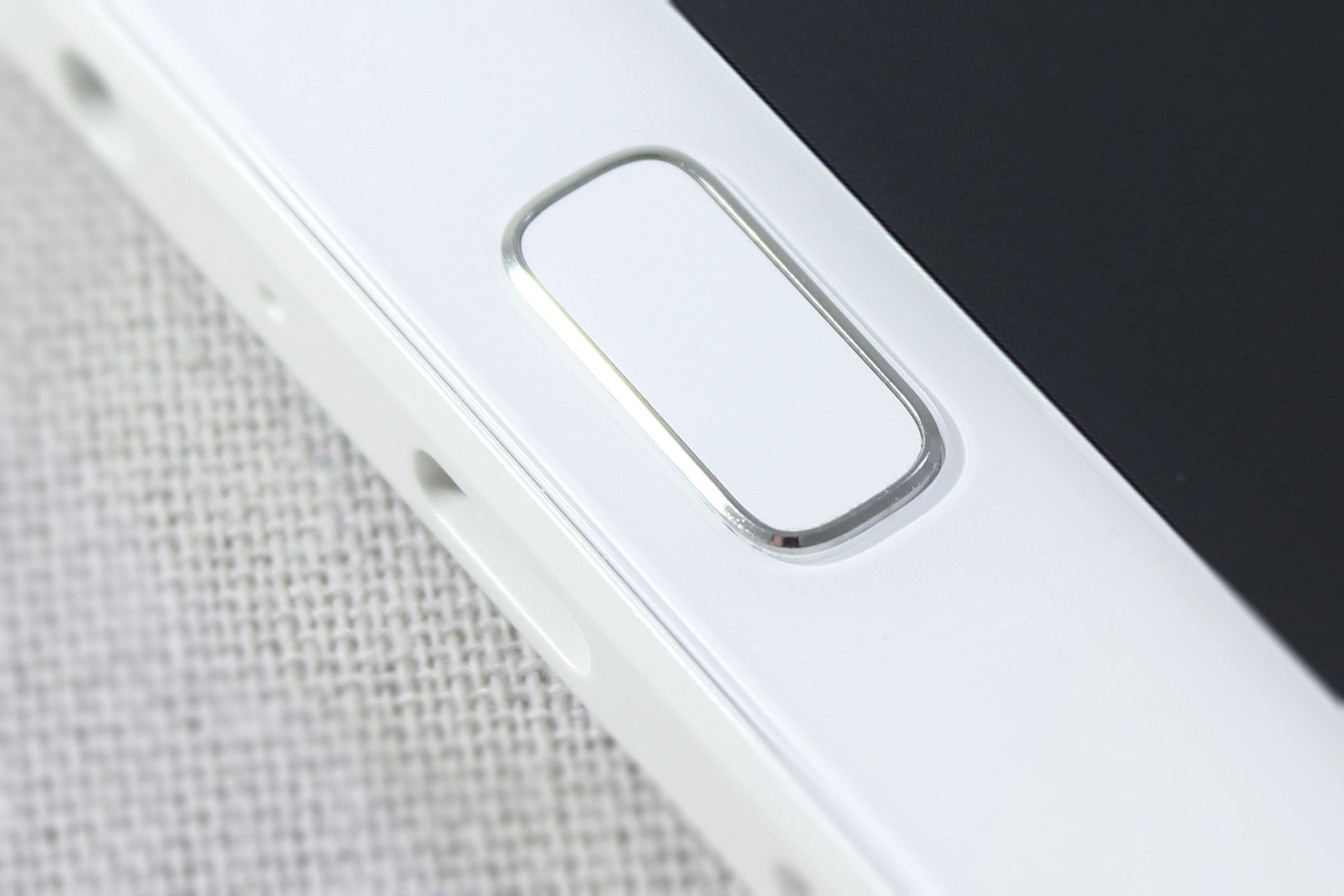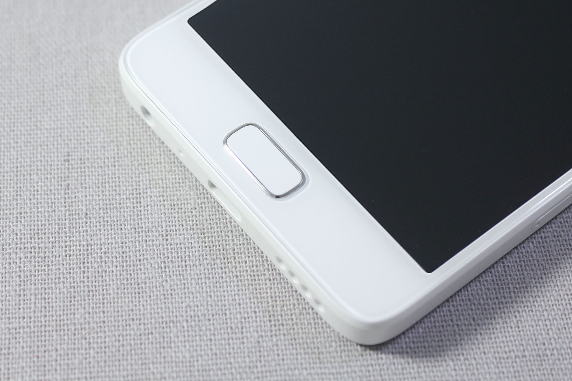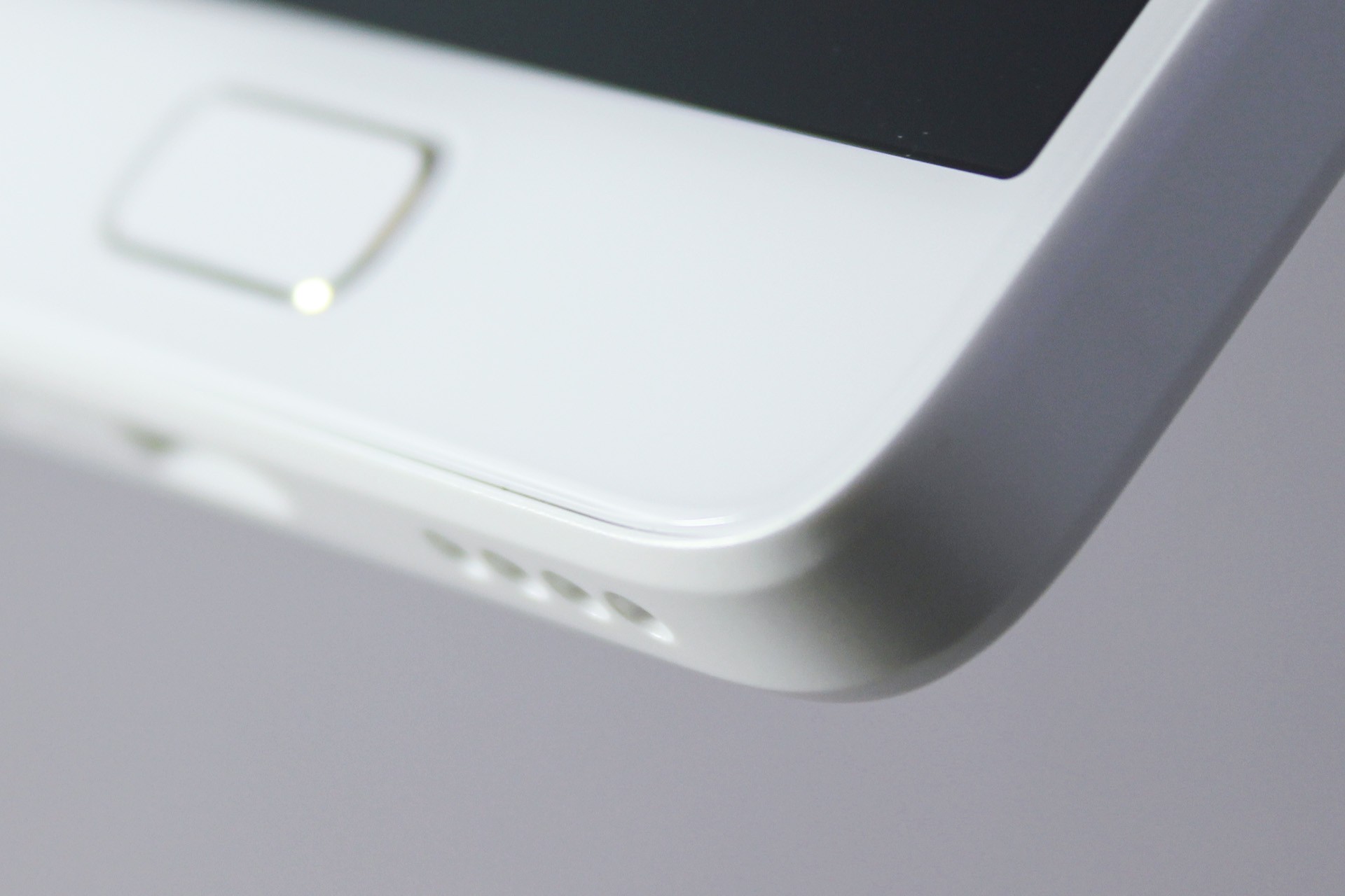 边框底部依次为耳机孔,麦克风,USB Type-C接口以及扬声器开孔。此处也能看到HOME键是略微凸起的设计。边框为高强度玻璃纤维材质,当然总体成分来说依然是塑料,和我用过的坚果手机中框一样,虽不比金属边框,但视觉上的珠光白效果以及手感比传统塑料边框还是好上不少,而且整体强度也有所提升。手指敲击边框的反馈也更为扎实。