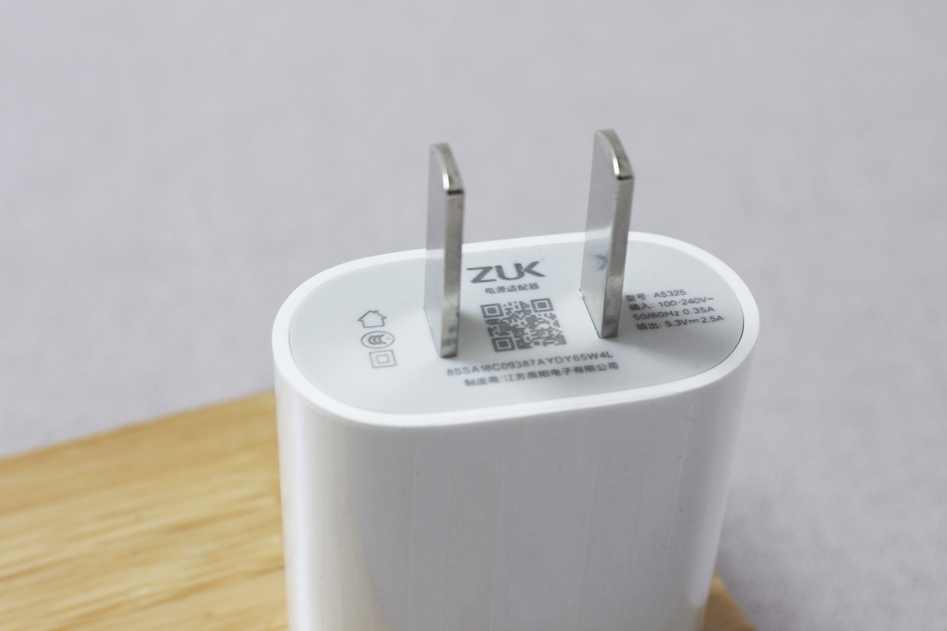 ZUK Z2的充电头由手机充电器国内市场占有率第一的辰阳电子生产代工,型号A5325,输出5.3V-2.5A。