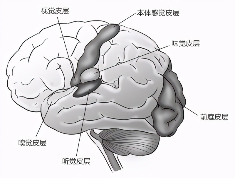 ● 脑部会将汇入其中的信息分配给6个不同的皮层区域(见图1),这6个区域分别负责6种不同的感觉信息:视觉、听觉、本体感觉(温痛触压以及身体姿态与运动信息)、嗅觉、味觉和平衡觉。所以如果从大脑的角度考虑感觉,那应该是“六感”而非五感。当然理论上这些感觉也可以再进一步细分,比如本体感觉皮层就承包了触觉、痛觉还有身体运动与姿态等信息,这些截然不同的感受每种都可以单独算作一种“感觉”。