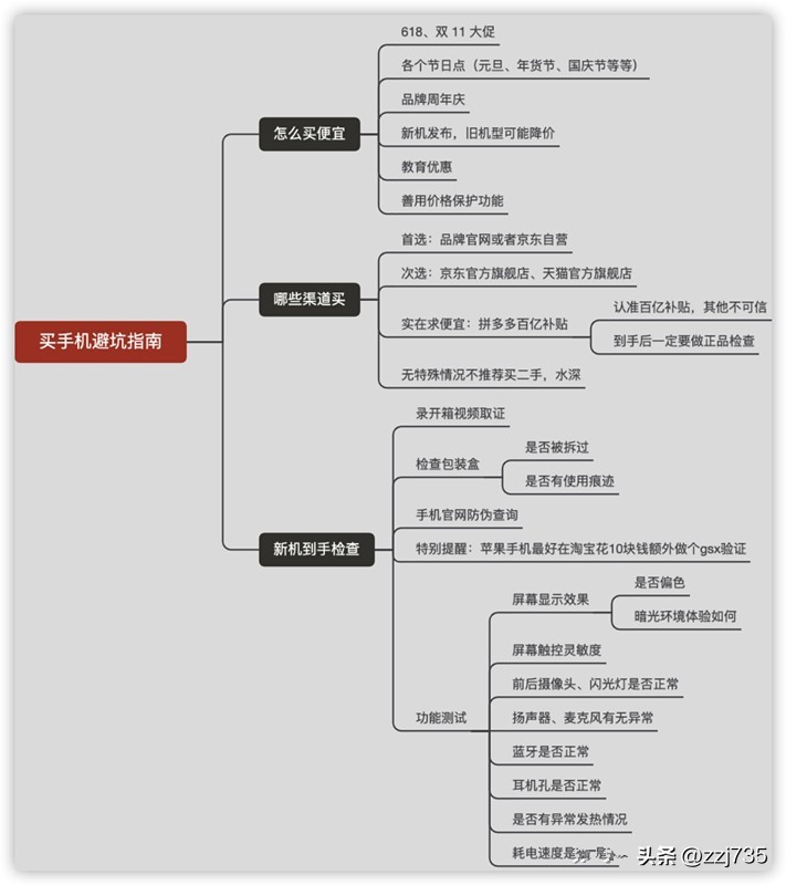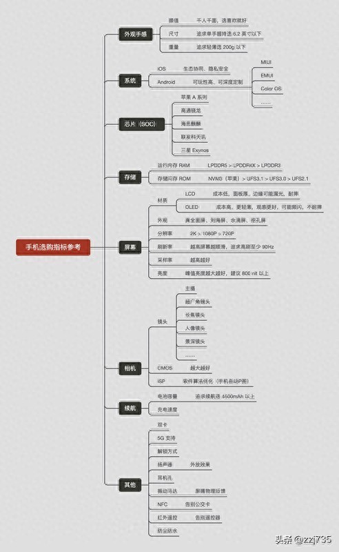 我这里总结了一张图,基本囊括了挑选一部手机过程中需要考虑的所有因素,以及各个因素的粗略的判断逻辑,没办法写得太细,不然就太长看不下去了,不想了解太多细节的直接看我下面的推荐就好了。