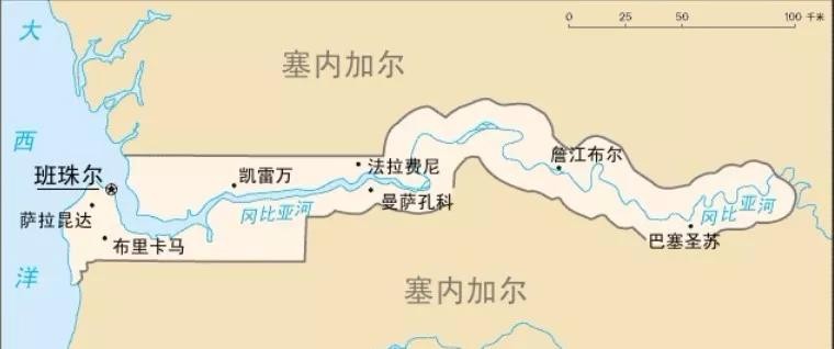 冈比亚(全称:冈比亚伊斯兰共和国,台湾地区称为“甘比亚共和国”)。冈比亚共和国位于北纬 13°28',,西经 16°39',非洲西部,西濒大西洋,海岸线长48公里,面积共10690平方公里。冈比亚共和国全境为一狭长平原,切入塞内加尔共和国境内。冈比亚河横贯东西,注入大西洋。