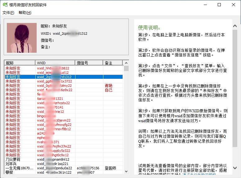 先在自己常用的电脑上登录上自己的微信账号,再打开“楼月微信好友找回软件”运行后软件将自动识别到当前登录的微信账号,再点击“查看好友信息”按钮等待软件读取完成,在软件左侧好友列表中红色的未知好友就是曾经删除后恢复回来的好友。再到未知好友中去查到需要找回的好友即可。