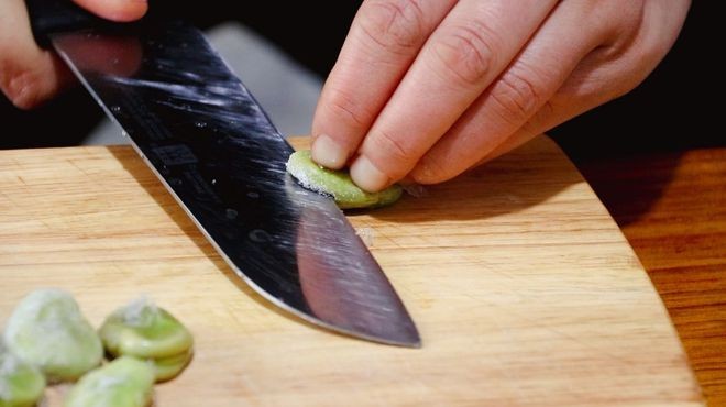 2、冷冻后的蚕豆,用刀对半切,不要切开。