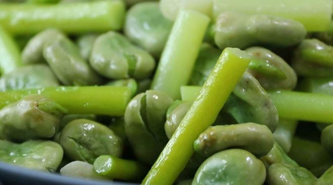 2、起锅烧油,油热后同时放入蚕豆和蒜苗,翻炒变得更翠绿,放入适量的盐调味,倒入一点清水,盖盖煮熟。
