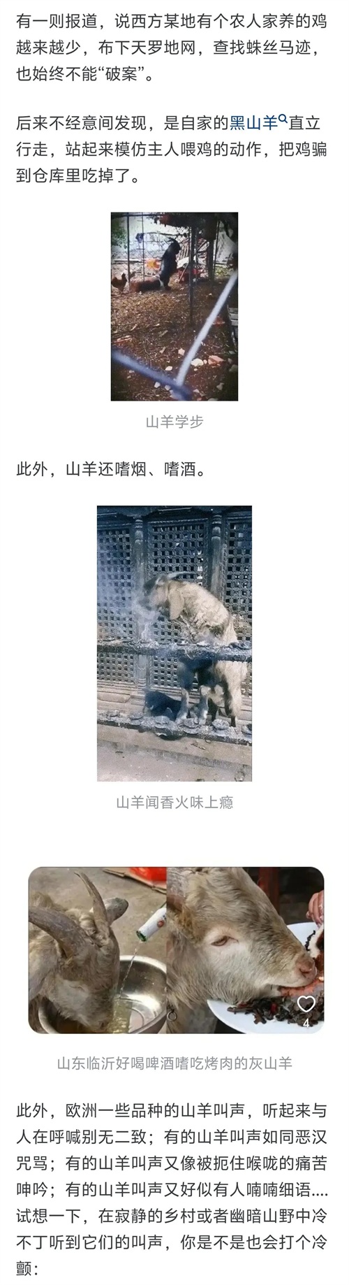 除此之外,山羊作为一种杂食性动物,还有一些人称"恐怖"的食性,如偷食人类小孩等。一位网友就调侃说:"难怪英语中羊和山羊用的是不同的词汇,这显然不是同一个物种啊!"