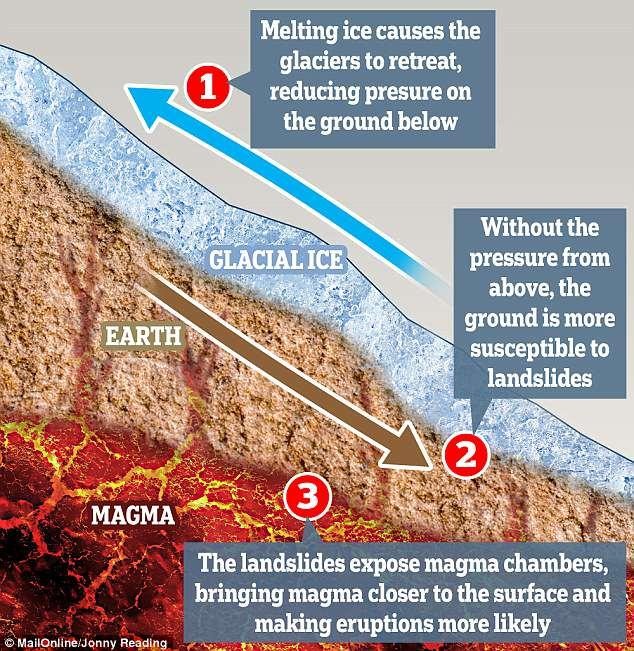 当冰从山坡上消融后,它使得地壳的压力陡然减轻,对于地壳而言,冰就像某种保护层,而火山其实是一个加压系统,当地面上的压力陡然减轻,这就加剧了火山喷发的可能性。