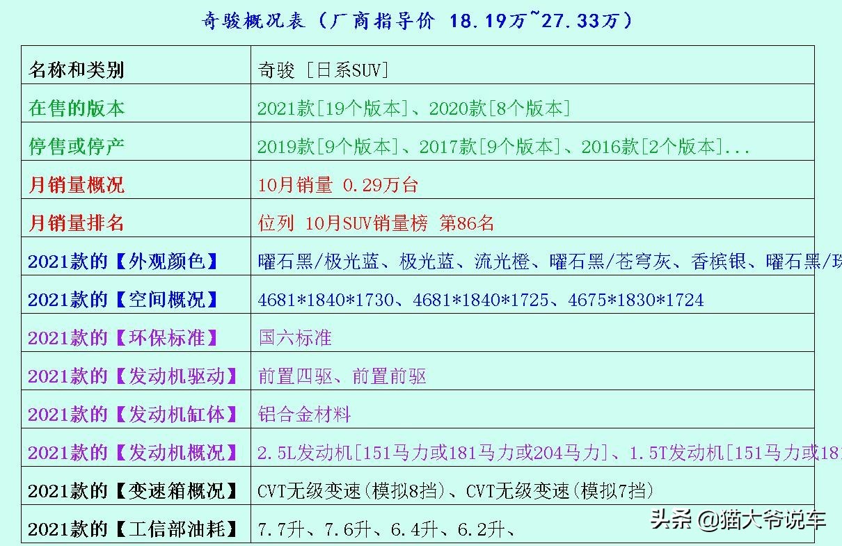 说起动力方面,我感觉奇骏还是相当不错的,因为它拥有了181马力的、强劲动力的动力总成,变速装置则是市场主流的CVT无级(模拟8挡),不少车友都认为奇骏的动力表现还是相当不错啦。另外,奇骏的发动机缸体材料采用铝合金,所以最终的使用寿命是非常赞的。排量版本上,奇骏的排量性能也是比较打动人心的,不仅有涡轮增压系统,并且还兼顾自吸装置,奇骏的排量版本只有2.5L、1.5T、2.0L,