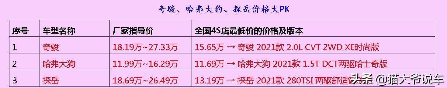 今儿个所列举的皆是SUV,厂商指导价却是高低不同的,分别为11.99w、18.19万及18.69万。值得重点留意的是,来自不同厂家的车型的价格还是有着大大的差异的。据悉,奇骏最低4S报价需要15.65万软妹币,哈弗大狗与探岳则低至11.69w、13.19w,可以发现,这些SUV价格差距还是蛮大的,不知道上面展示的这些SUV有哪台是你最喜爱的呢?在这里作者君衷心地祝愿有缘的老友记们年年有余、天天乐开怀。假如你喜欢在下的话,记得给个赞啦。