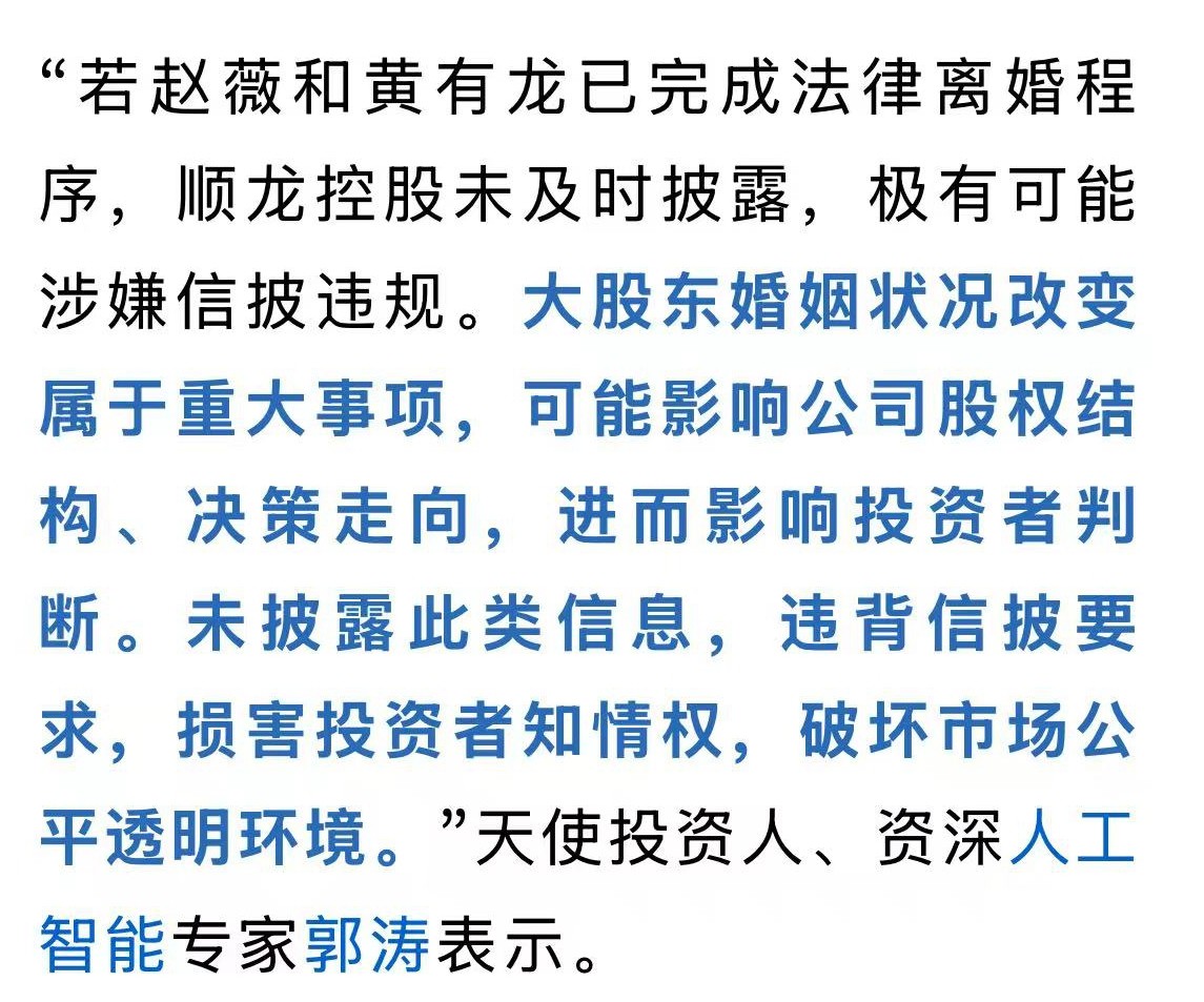 媒体报道,赵薇与黄有龙完成了法律离婚程序,但“顺龙控股”没有及时披露,极有可能涉嫌信披违规。