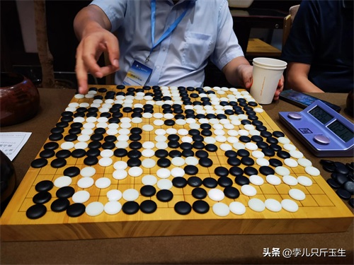 最后一轮我执白,序盘开始各种Al定式,局势相当平稳。中盘关键时刻,断开的地方很复杂,不好定型,突然我灵光一闪,先二路托一下试应手(见图),邵羽马上陷入了长考,本来应该扳住,结果他没敢扳退了一个,白棋先手获得了巨大实利,一举扭转战局。