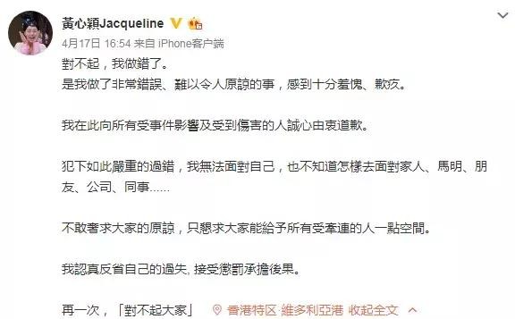 另外两个当事人许志安和黄心颖此前已发文道歉。