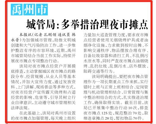 在此基础上,该局对禹州市设置的夜市摊点加强管理,每天晚上组织力量加大巡查管理力度,要求夜市摊点经营者使用无烟烧烤炉具或者油烟净化设施,力求做到按时出摊、不影响交通秩序、物品摆放合理有序、自备垃圾容器和清扫工具、不乱倒污水泔水等,同时严查夜市摊点油烟烧烤、乱扔垃圾、乱倒污水、店外摆放、阻碍交通等行为。