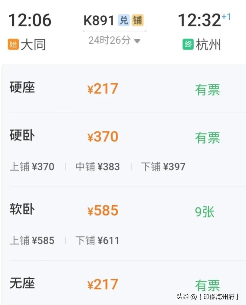 而乘坐K891次列车,从大同到杭州,最低只需要217元,这点钱,还不够加满一箱油的。