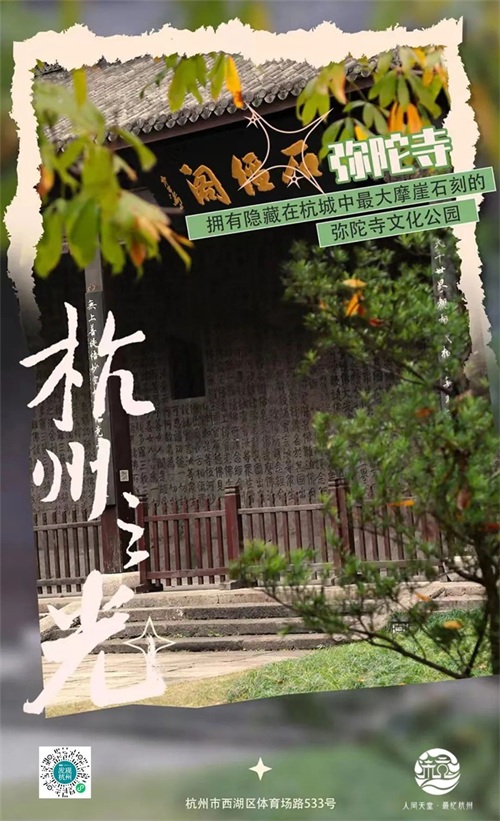 最后来到已有130多年历史的弥陀寺,这里曾是清末、民国初年杭州城四大寺院之一。虽然整体风貌早已受损,但保留有一整面山墙的巨幅摩崖石刻,这是目前杭州最大的摩崖石刻。弥陀寺文化公园在老弥陀寺旧址上修复而成,“明远书院”入驻弥陀寺文化公园法雨庵,为这里增添了一抹浓浓的书香,让人在漫步中感受到历史的厚重与文化的传承。