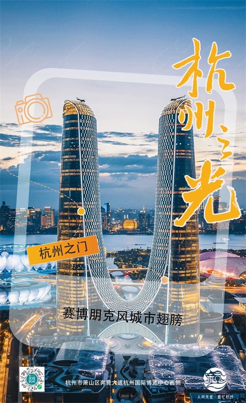 旅程的第一站,我们前往杭州之门。这座位于杭州奥体博览城核心位置的双子塔建筑,以杭州拼音首字母“H”为外形蓝本,由“迪拜塔”设计团队精心打造。双塔像一对展翅飞翔的翅膀,寓意着杭州的蓬勃发展与未来希望。当夜幕降临,杭州之门亮起璀璨的灯光,宛如一座科幻电影中的城市翅膀,非常适合拍照留念,记录下这份独特的未来感。