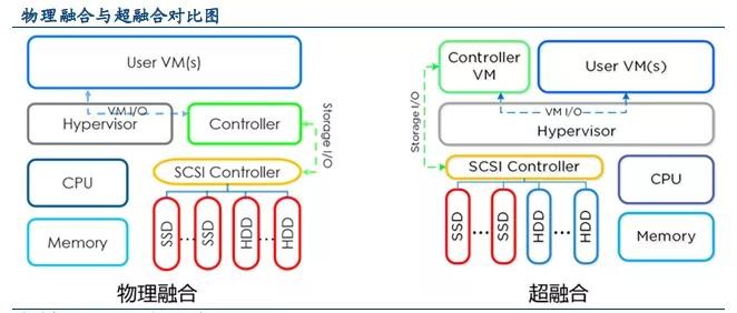 “融合”是指计算和存储部署在同一个节点上,相当于多个组件部署在一个系统中,同时提供计算和存储能力。物理融合系统中,计算和存储仍然可以是两个独立的组件,没有直接的相互依赖关系。超融合则重点以虚拟化计算为中心,计算和存储紧密相关,存储由虚拟机而非物理机CVM(Controller VM)来控制并将分散的存储资源形成统一的存储池,而后再提供给Hypervisor 用于创建应用虚拟机。