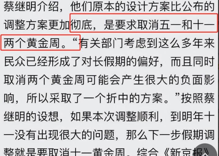 “偷走了”五一假期后的蔡继明,并没有死心,又开始打起了国庆假期的主意。蔡继明在十月一假期改革的提案中表示,要直接将十月一假期取消。