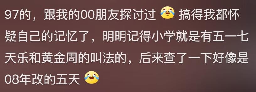 有九零后的网友回忆起五一放假七天的经历,以为是自己记忆混乱了,跟零零后的朋友探讨,他们也毫无印象。