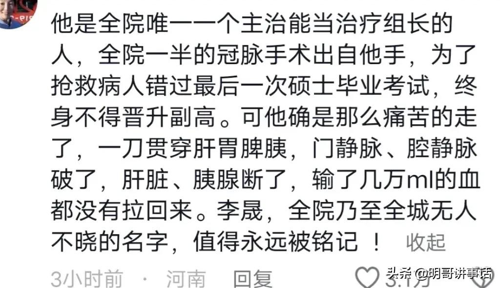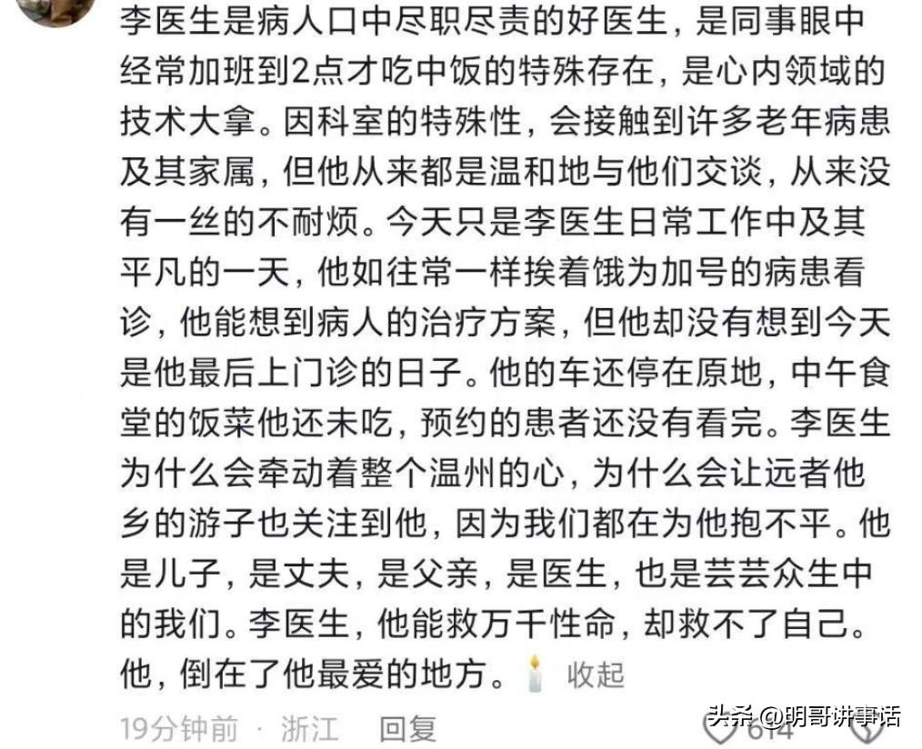 网友们也这样评论:现在像李医生这样医术高、口碑好的医生真的不多了。他在全国心内科界都很有名。一个医院和家庭要培养出一个技艺高超的优秀医生,得花好多年,李医生的离世真的太令人惋惜了。