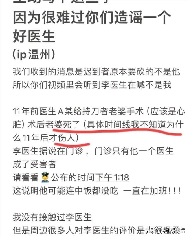 改文:网上有消息说,凶手的老婆以前在这家医院做了心脏手术,手术后不久她就去世了。可是,为啥等了整整11年后,这人才出来报复呢?而且李医生根本就没给他老婆做过手术!