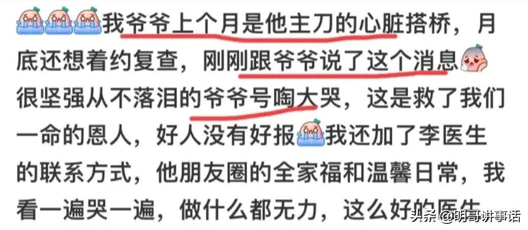 李医生人超好,名声也很不错。作为医生,他还特别贴心,经常加患者的联系方式,这在医生里可不常见。他自己家人的手术也是他亲自操作的,原本这个月还打算带家人去复查呢,现在一切都没机会了。家里人听到这消息,心里都特别难受。