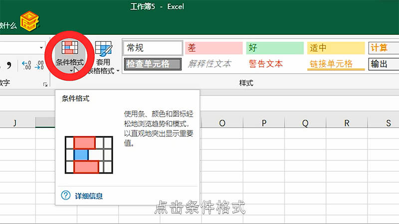 1、选中数据范围,在菜单中点击开始,找到样式板块,点击格式条件。