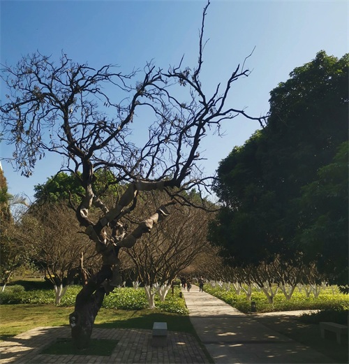 穿过清风亭,前面就是荔枝林,由于荔枝的季节刚过,显得树枝蔓延,千姿百态,在这无边的秋色里显得更有韵味。