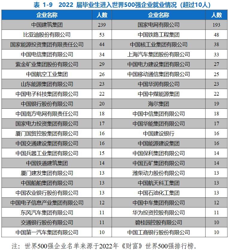 2022届普通毕业生进入世界500强企业就业的人数有1509人,同比2021届增加243人;毕业生入职超过10人的世界500强企业共44家,同比去年增加14家。