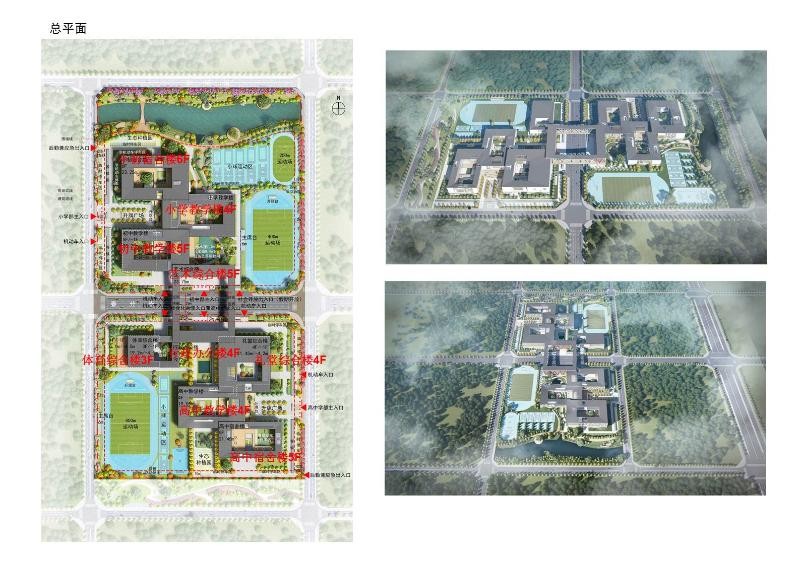 根据该项目建议书批复,项目总建筑面积约15.84万㎡,拟设计办学规模为132个班,其中小学48个班、初中48个班、高中36个班。主要建设内容包括:教学楼、综合楼、行政图书楼、风雨操场、报告厅、宿舍楼、食堂、体育看台、地下车库等;配套建设室外运动设施包括环形田径场及足球场、篮球场、排球场、乒乓球场、羽毛球场等。