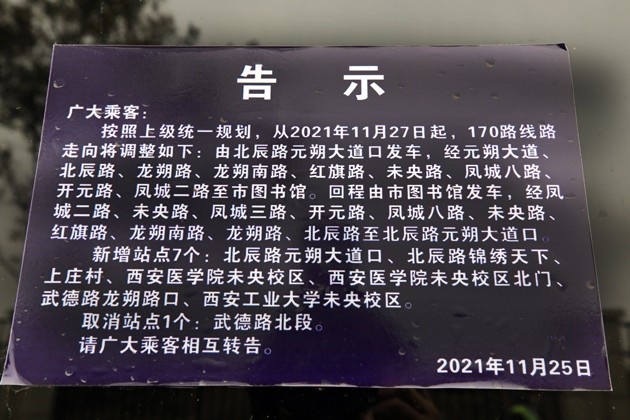 西安市公交六公司二车队队长杨光介绍说:“170路公交车改线主要是为了方便北郊大学城几所学校师生的出行,这这个地方公交线路少,车辆间隔时间也长。西安医学院向公司提出了延长线路增加站点的申请,在西安公交六公司、西安医学院、西安医学院一附院的共同努力下,于17日170路公交线路终于获批正式改线开通”。