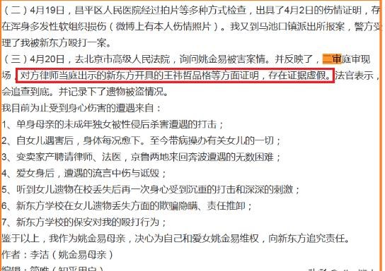 值得注意的是,关于新东方是否出具了所谓的“品格证明”,姚金易母亲在微博中有所提及。她提到,新东方出具的学员证明原件并无“表现良好、从轻处罚”等内容。此外,新东方方面表示会积极配合北京高院对证据的依法调查。