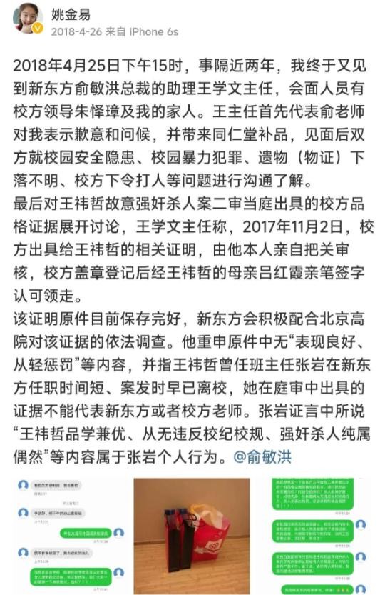 2021年5月20日,姚金易母亲最后一次在微博上更新了关于此案的信息,她转发了澎湃新闻对姚金易案民事诉讼一审的报道。在这篇报道中,我们可以了解到,姚金易的母亲明确表示不向新东方学校主张赔偿,而新东方方面则表示与姚金易母亲已经达成和解。此外,关于新东方是否出具了“品格证明”的问题,姚金易母亲也在微博中进行了澄清。
