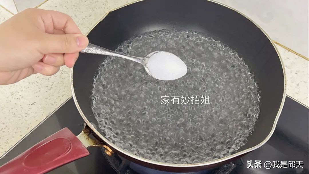 接下来我们在锅中倒入多一些的清水,然后加入一勺食盐增加底味,再开大火把锅中的水给它烧开。