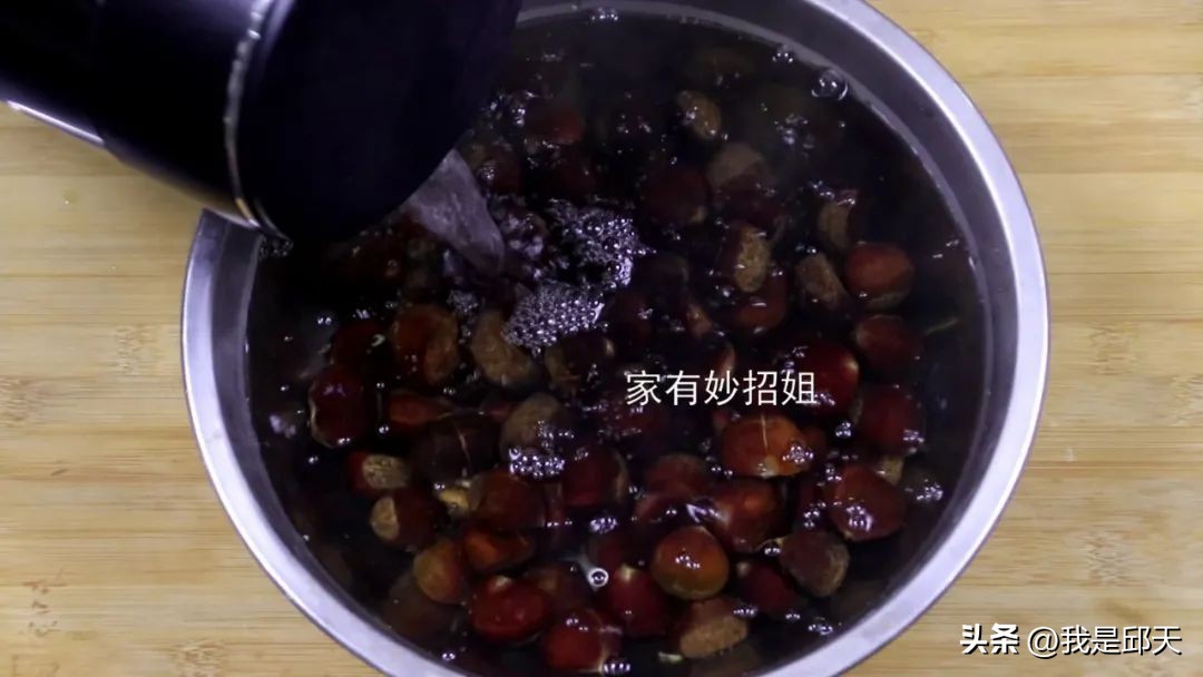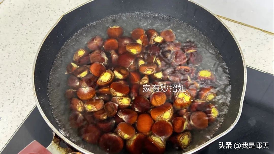 烧开后再将清洗干净的板栗全部倒入锅中,继续用大火煮上两分钟的样子就可以了。煮的时间不要太长,不然板栗就会完全煮熟,这样剥的时候,里面的果肉很容易会碎掉。