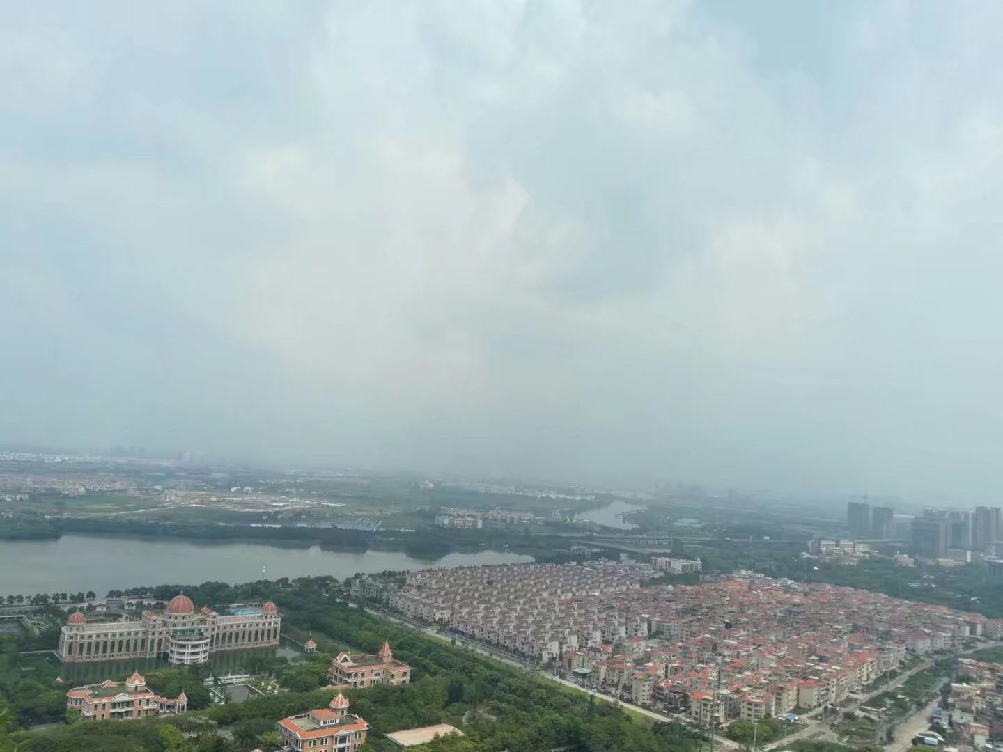 在观景台往南看,是顺德新城区。顺德新城区的建设规模越来越大,越来越好。远处,是堂皇的区政府大楼和 鳞次栉比的高楼大厦;近处,从华桂园到区政府大楼之间,是抢眼的、连片的、金黄琉璃瓦别墅群一一碧桂园钻石湾。听说每一套别墅,都价值过千万。其规模之大,令人惊叹,尽现顺德的富庶与豪华。