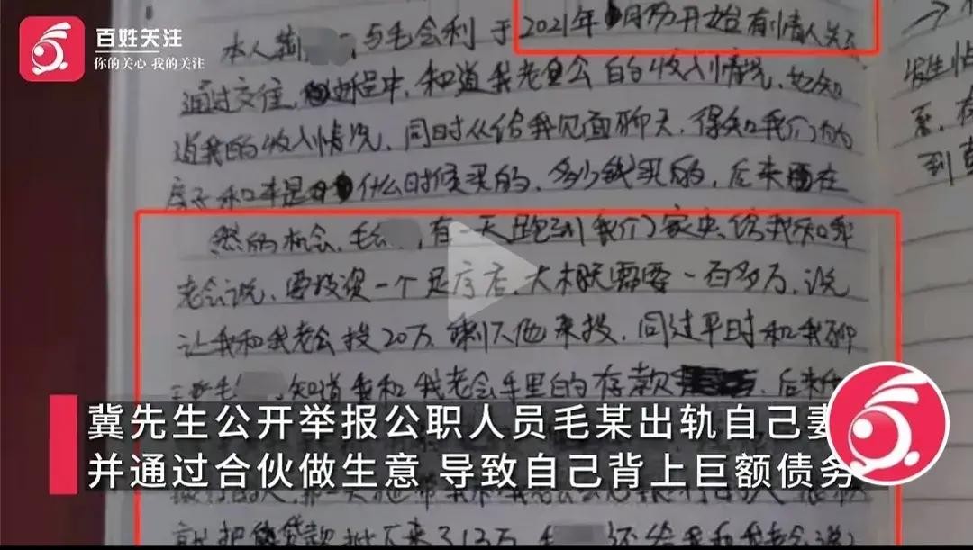 这出戏码要从一份保证书说起。举报人冀某,在网上手持身份证并实名举报三门峡市城乡规划监察支队科长毛某,控诉毛某出轨自己妻子荆某,并诱使自己投资一家足疗店导致巨额债务。