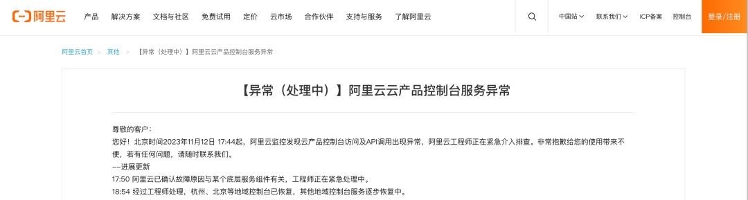 双十一刚过,阿里云发生故障,阿里回应多款应用崩了:已全面恢复