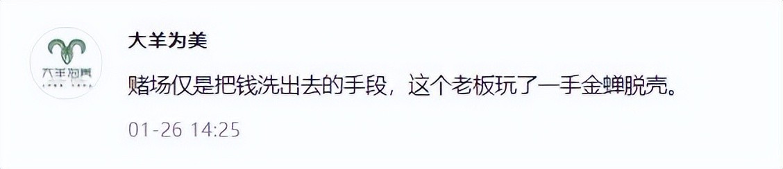 网上有说刘老板去塞班岛赌钱,输了上百亿,当然后来金立出面反驳,说是捏造,可后来对刘立荣进行采访的时候,他自己都说,哪有上百亿,也就十几亿,当然,对这些话,猫眼儿不做评论,但网友们的怀疑还挺有意思的,来看看这位网友说的赌场就是把钱洗出去的手段,这个老板玩了一手金蝉脱壳。
