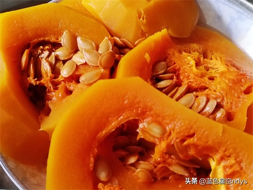 原材料准备:1、南瓜切片上锅蒸熟,南瓜籽可以先抠下来更方便。