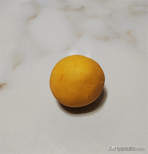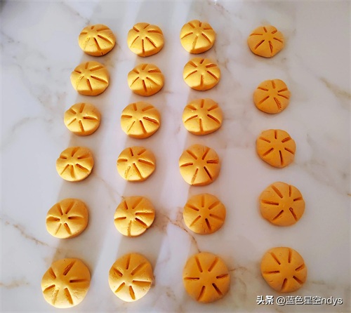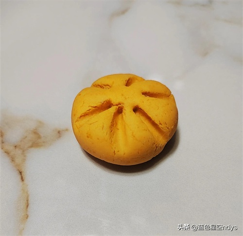 4、取适量面团揉成汤圆状,稍压扁,用筷子压出南瓜的纹样。
