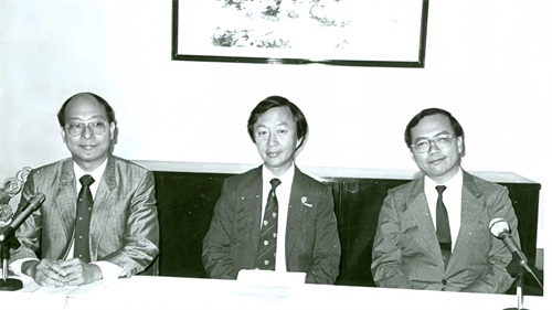 1987年候任国立中山大学大校长时的高锟(中)与时任国立中山大学教务长杨汝万(左)及秘书长梁少光(右)