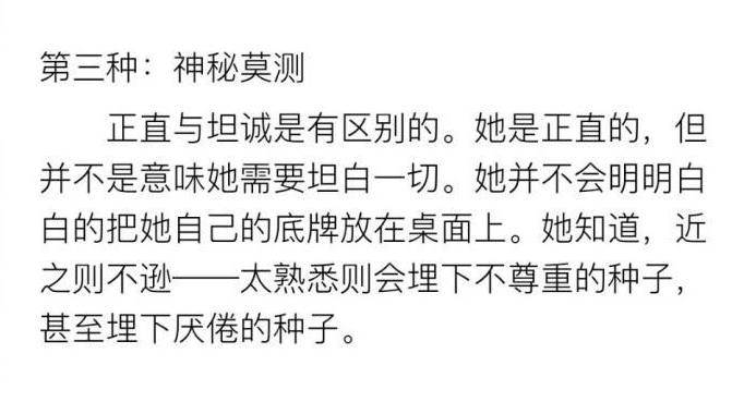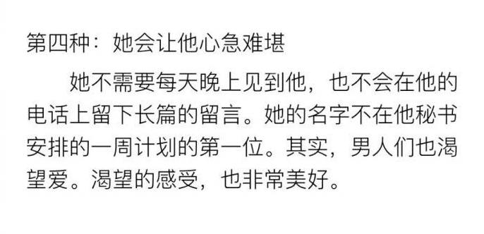 这一点是指那种永远不让男人猜得透的女人,永远都保留着自己的底牌,让男人自己去发现自己的优点和亮点,这样的话他每天都会有新的惊喜,不知道你还有多少是他不知道的,这一点最能诱惑,使他上瘾和着迷。