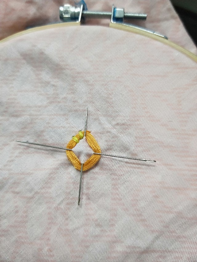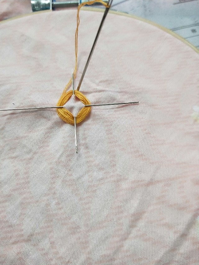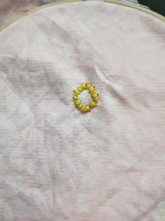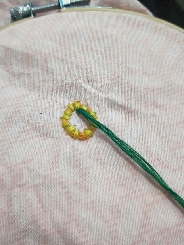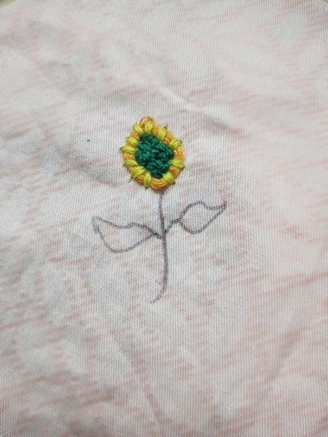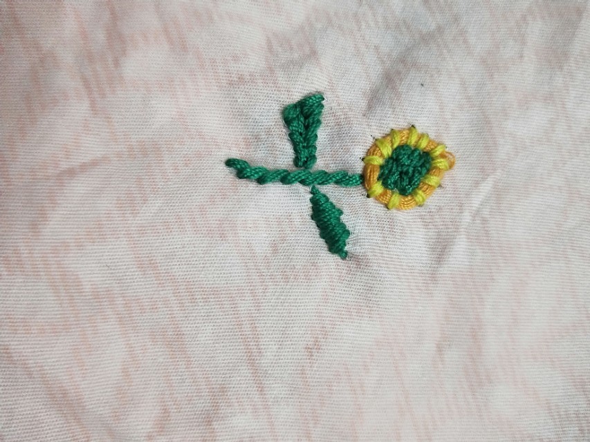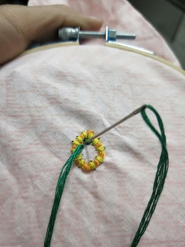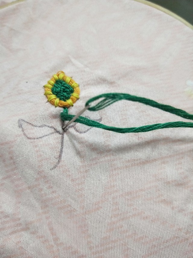 5.用线在圆圈里一个一个的用线绣起来。绣好之后用笔把叶子画起来。
