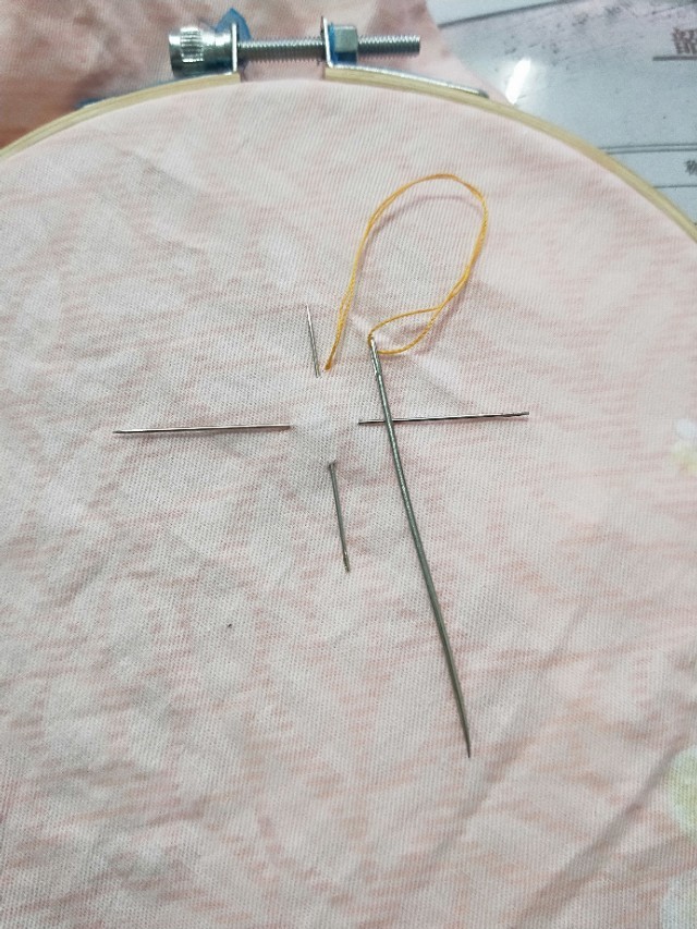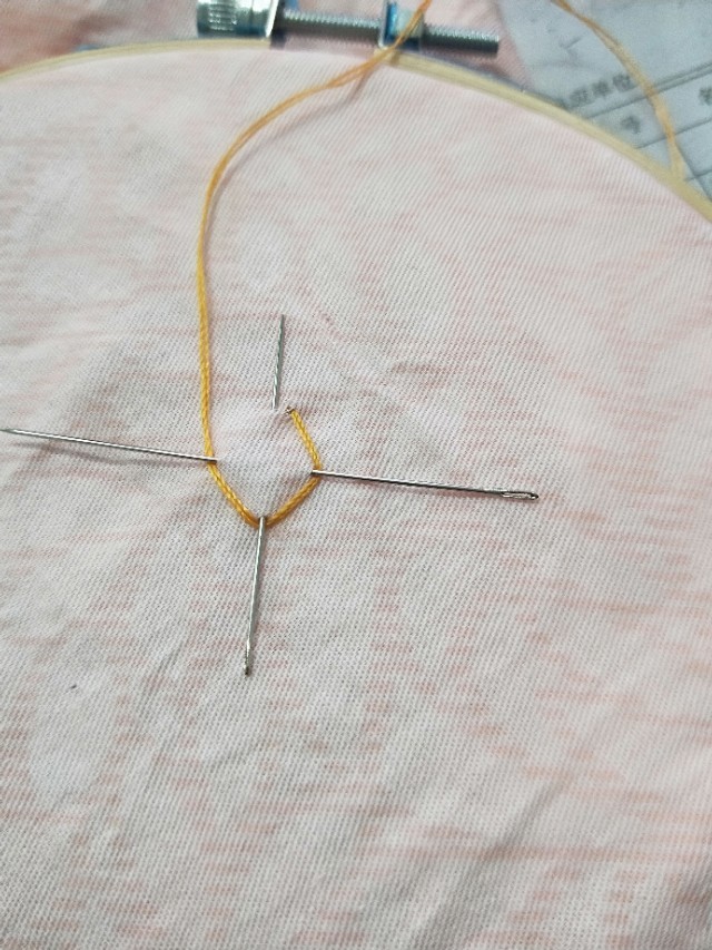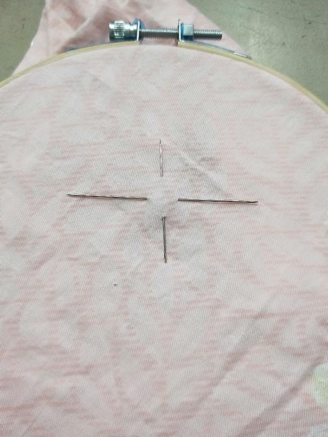 1.先准备好两根针,交叉插在布料上。