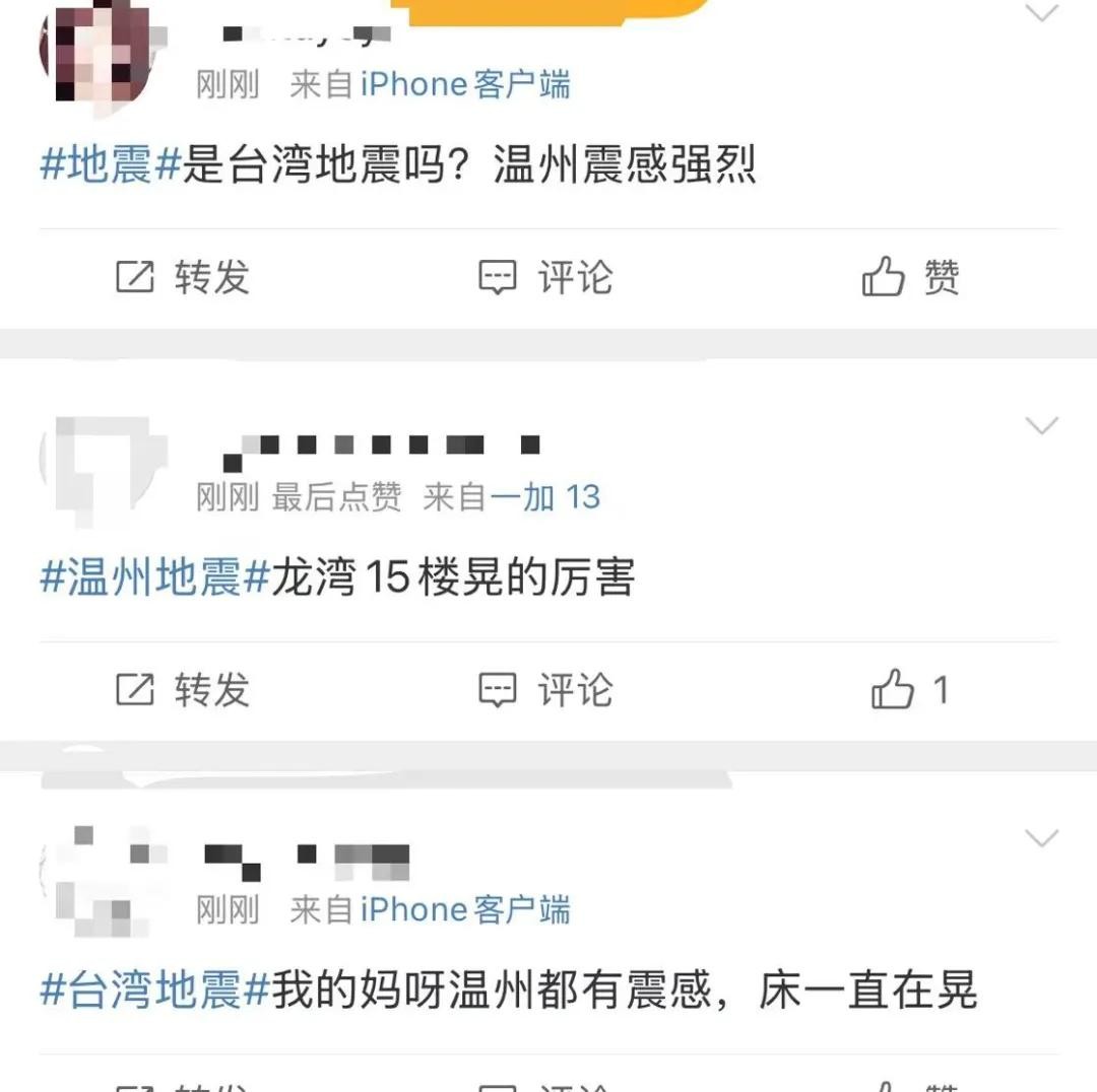 地震造成台湾全岛震感强烈,浙江多地网友表示:震感明显。