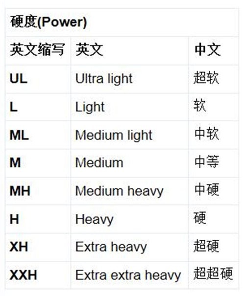 竿子的调性级别:(常用?的路亚竿调性通常是以参数的形式标明在竿体上)。按软、硬区分:超软(UL)、软(L)、中软(ML)、中调(M)、中硬(MH)、硬(H)。(