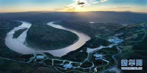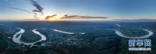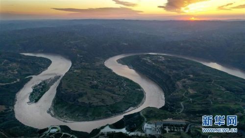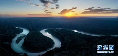 这是8月14日无人机拍摄的朝霞下的黄河乾坤湾景色。 新华社记者 陶明 摄