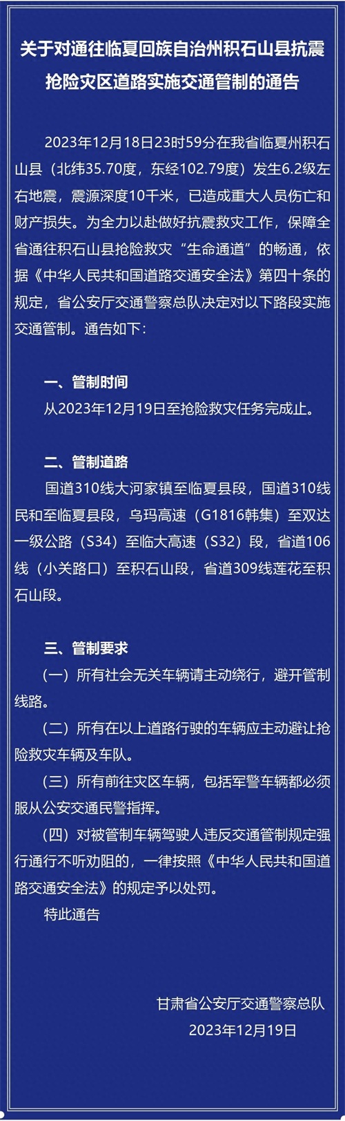 【甘肃交警:抗震抢险灾区道路交通管制】“甘肃公安”微信号消息,甘肃公安厅交警总队发布《关于对通往临夏回族自治州积石山县抗震抢险灾区道路实施交通管制的通告》。其中提到,为全力以赴做好抗震救灾工作,保障全省通往积石山县抢险救灾“生命通道”的畅通,甘肃省公安厅交通警察总队决定对以下路段实施交通管制:国道310线大河家镇至临夏县段,国道310线民和至临夏县段,乌玛高速 (G1816韩集) 至双达一级公路 (S34) 至临大高速 (S32) 段,省道106线 (小关路门) 至积石山段,省道309线莲花至积石山段。从12月19日至抢险救灾任务完成止,所有社会无关车辆请主动绕行,避开管制线路;所有在以上道路行驶的车辆应主动避让抢险救灾车辆及车队;所有前往灾区车辆,包括军警车辆都必须服从公安交通民警指挥;对被管制车辆驾驶人违反交通管制规定强行通行不听劝阻的,一律按照《中华人民共和国道路交通安全法》的规定予以处罚。(中新经纬APP)