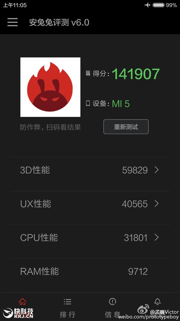 今天,微博认证为前凤凰网数码频道编辑的网友@孟巍Victor 放出了一张小米5高配版的安兔兔跑分截图,显示成绩高达141907,基本和官方宣传的差不多了,这也是第一次看到如此高的分数。