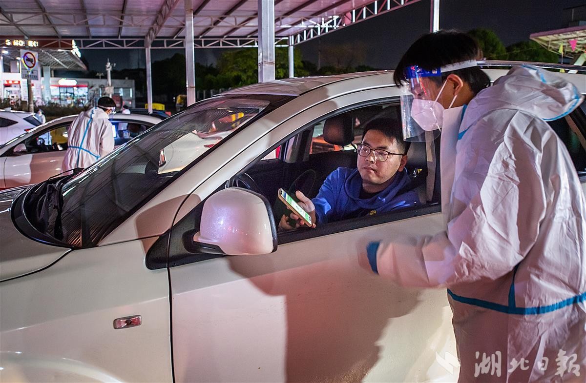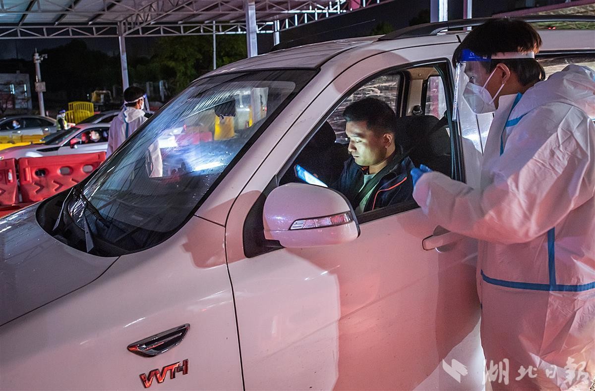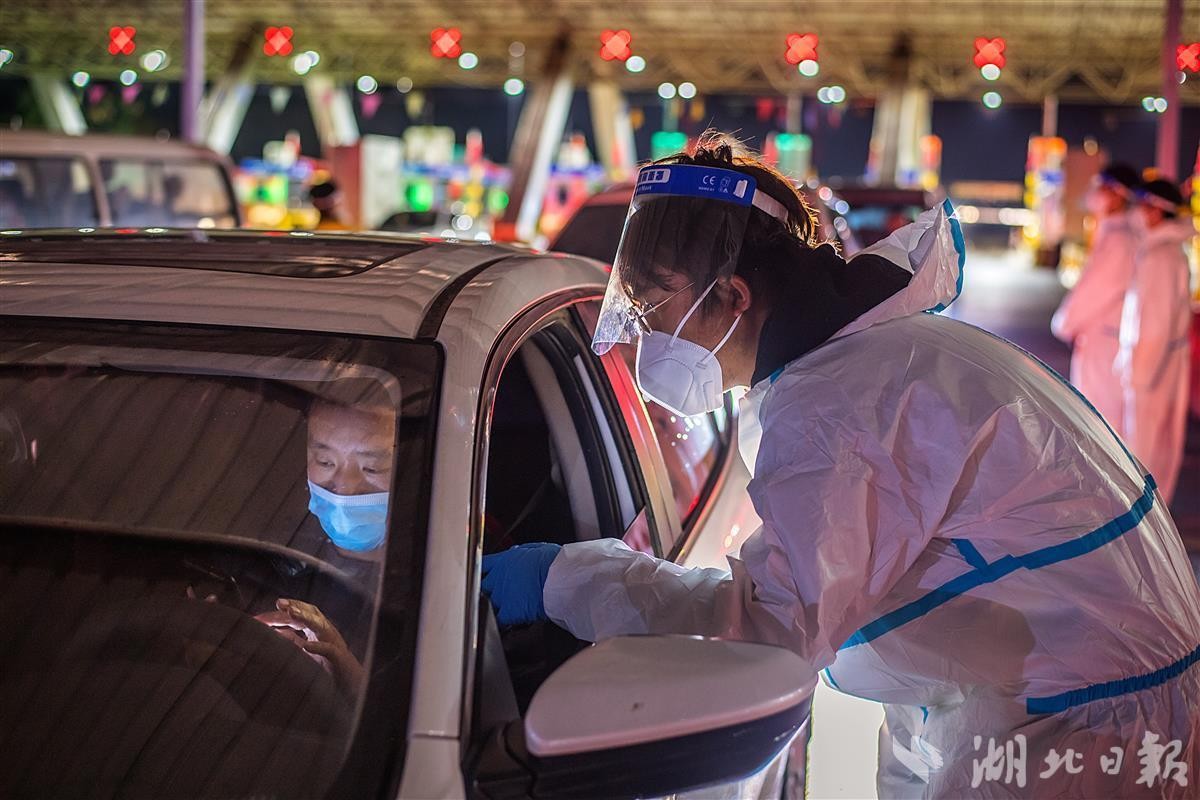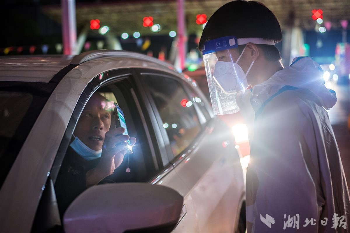 10月7日是国庆假期最后一天。当晚,大批返程车辆雨夜驶入武汉武鄂高速龚家岭收费站,防疫工作人员冒雨值守,逐一对出收费站的车辆司乘测温、扫码,做核酸,来(返)鄂车辆“逢车必查、逢人必检”,做到疫情防控、通行保畅、交通安全三不误。